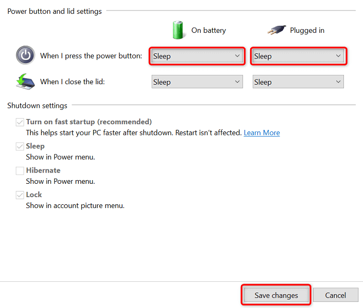 - Elegir Dormir de los dos En la batería y Conectado menús desplegables junto a Cuando presiono el botón de encendido.