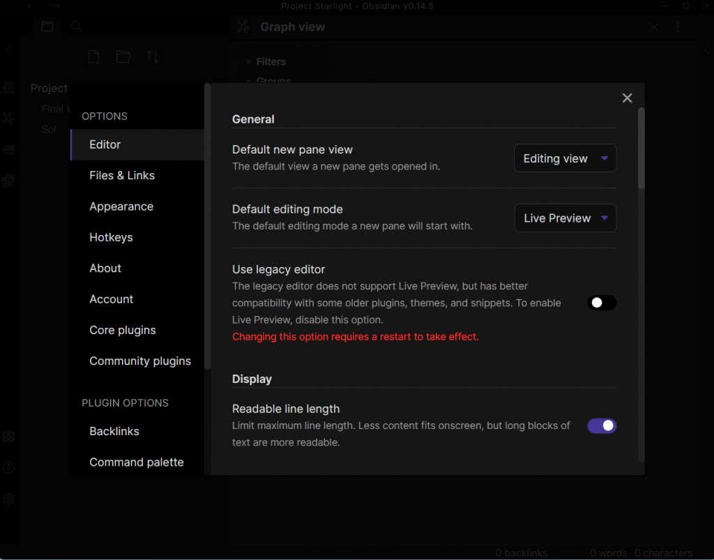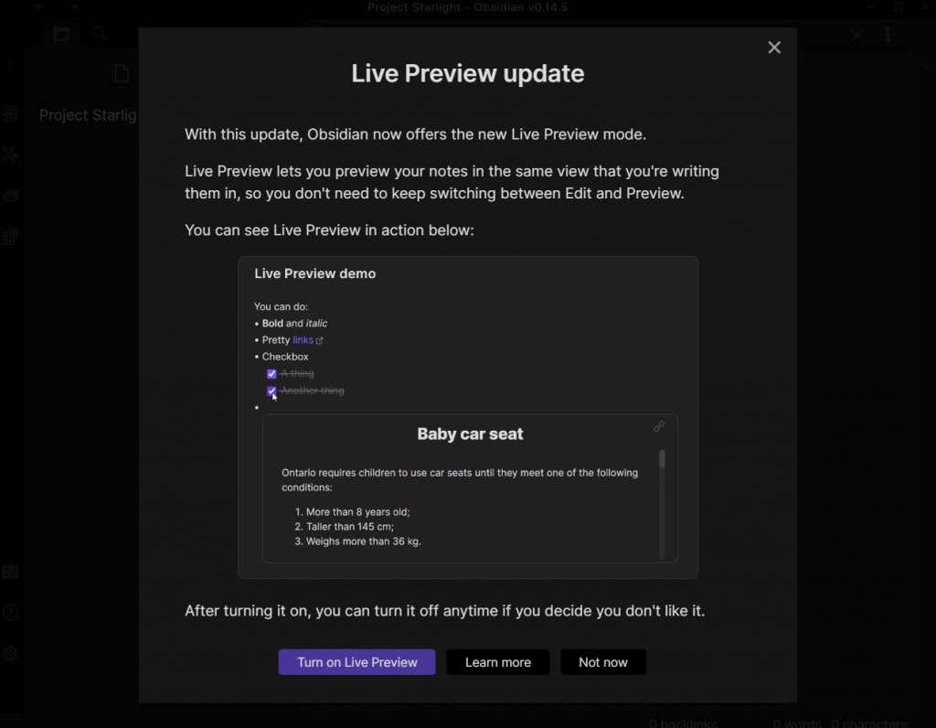 - La última versión de Obsidian viene con una función de vista previa en vivo. Básicamente, le permite ver los efectos del formato Markdown directamente (como un editor WYSIWYG) en lugar de tener que cambiar a una vista previa. Recomendamos encenderlo.