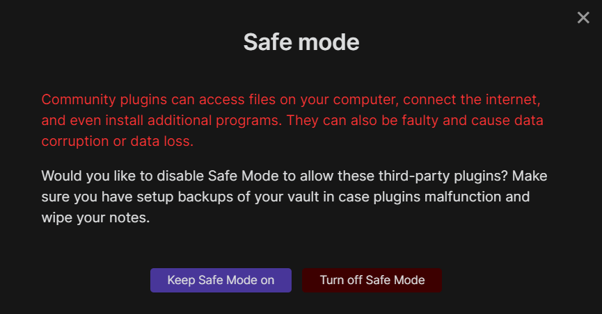 - Se le pedirá que confirme la elección, con una advertencia sobre los riesgos que plantean los complementos mal hechos. Seleccione Desactiva el modo seguro para proceder.