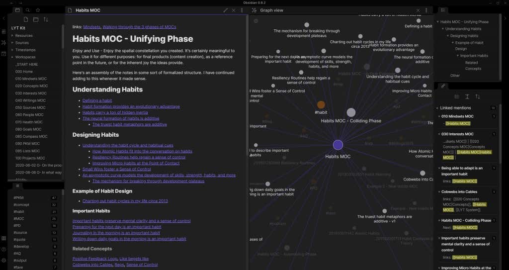 Obsidian le brinda la capacidad de crear sus propios wikis con una red de nodos interconectados, lo que le permite organizar sus pensamientos (o investigaciones) en un formato más natural. Hay muchas aplicaciones de «mapeo cerebral» que ya hacen eso, pero ninguna es tan limpia y fácil de usar como Obsidian.