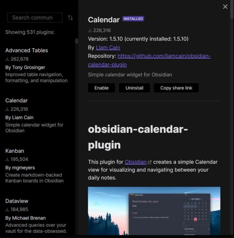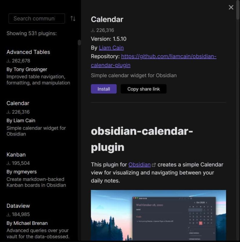 Y hay bastantes complementos disponibles. Como con cualquier herramienta gratuita, Obsidian tiene una comunidad grande y activa. Hay complementos para agregar todo tipo de funcionalidades a Obsidian, lo que la convierte en una herramienta de productividad a la par de Trello o Notion.