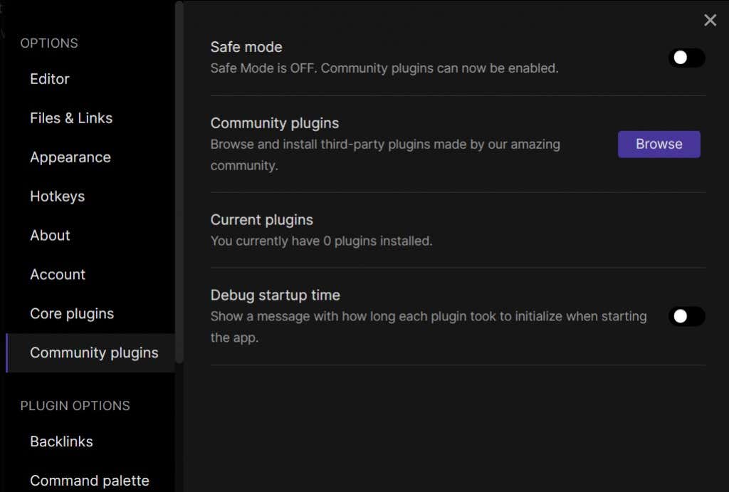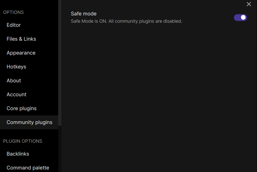 - Por defecto, Modo seguro está activado, lo que impide que se instalen complementos de la comunidad en su PC. Utilice el botón para apagarlo.